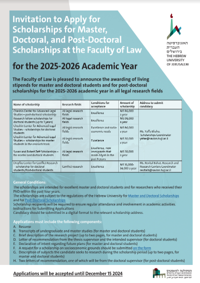 The scholarships are subject to the regulations of the Hebrew University for qualified and doctoral scholarships and for post-doctoral scholarships. Continuous attendance and involvement in the academic activity will be required from the scholarship recipients.